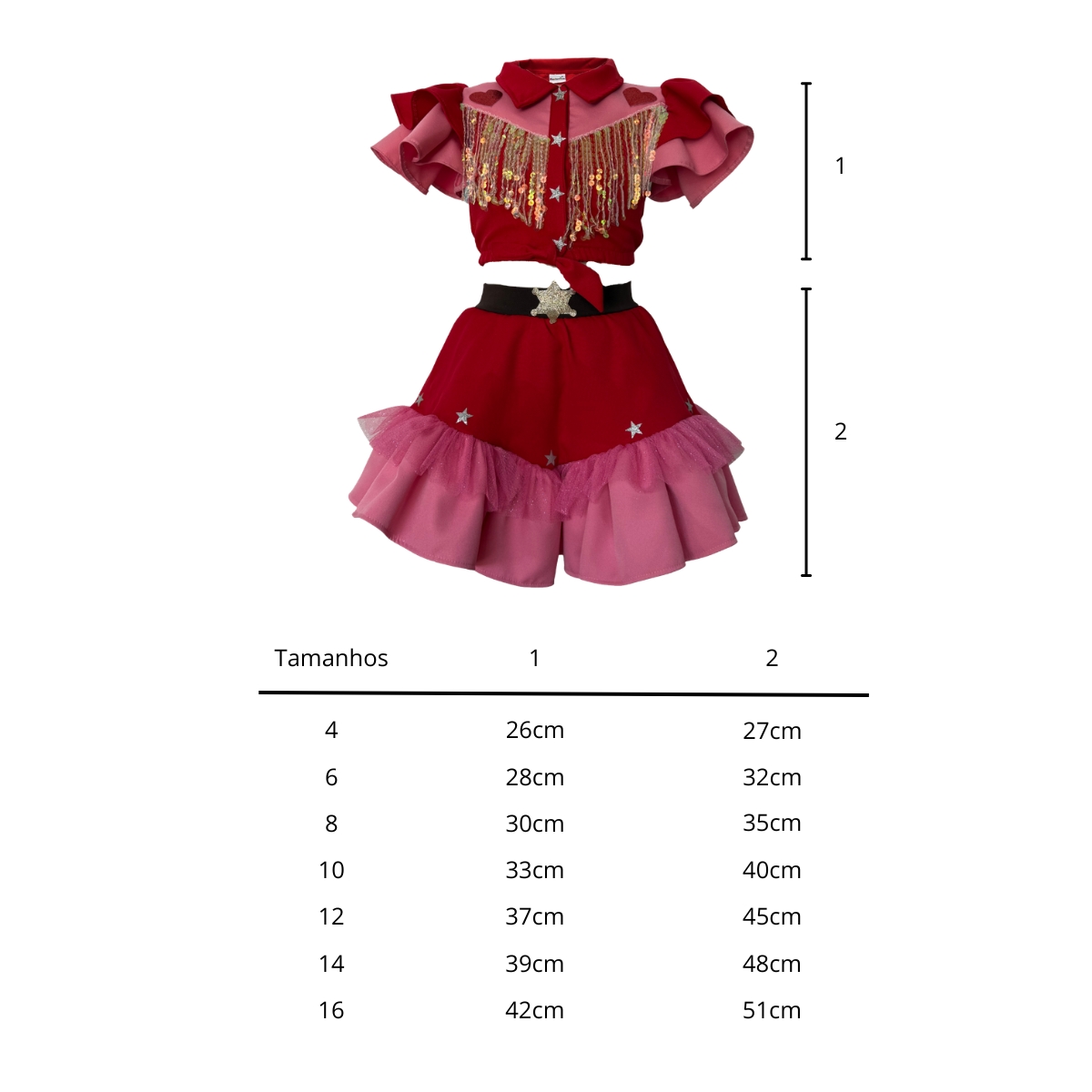 A escolha perfeita para quem vai dançar country na festa junina, diferente e cheio de presença. O conjunto Patricinha Boiadeira remete a cultura do rodeio brasileiro, e também um estilo que está em grande evidencia. Produzido nas cores rosa e vermelho, o color block está tendo bastante destaque nas tendencias atuais, misturas que trazem requinte e personalidade para o Conjunto Patricinha Boiadeira.