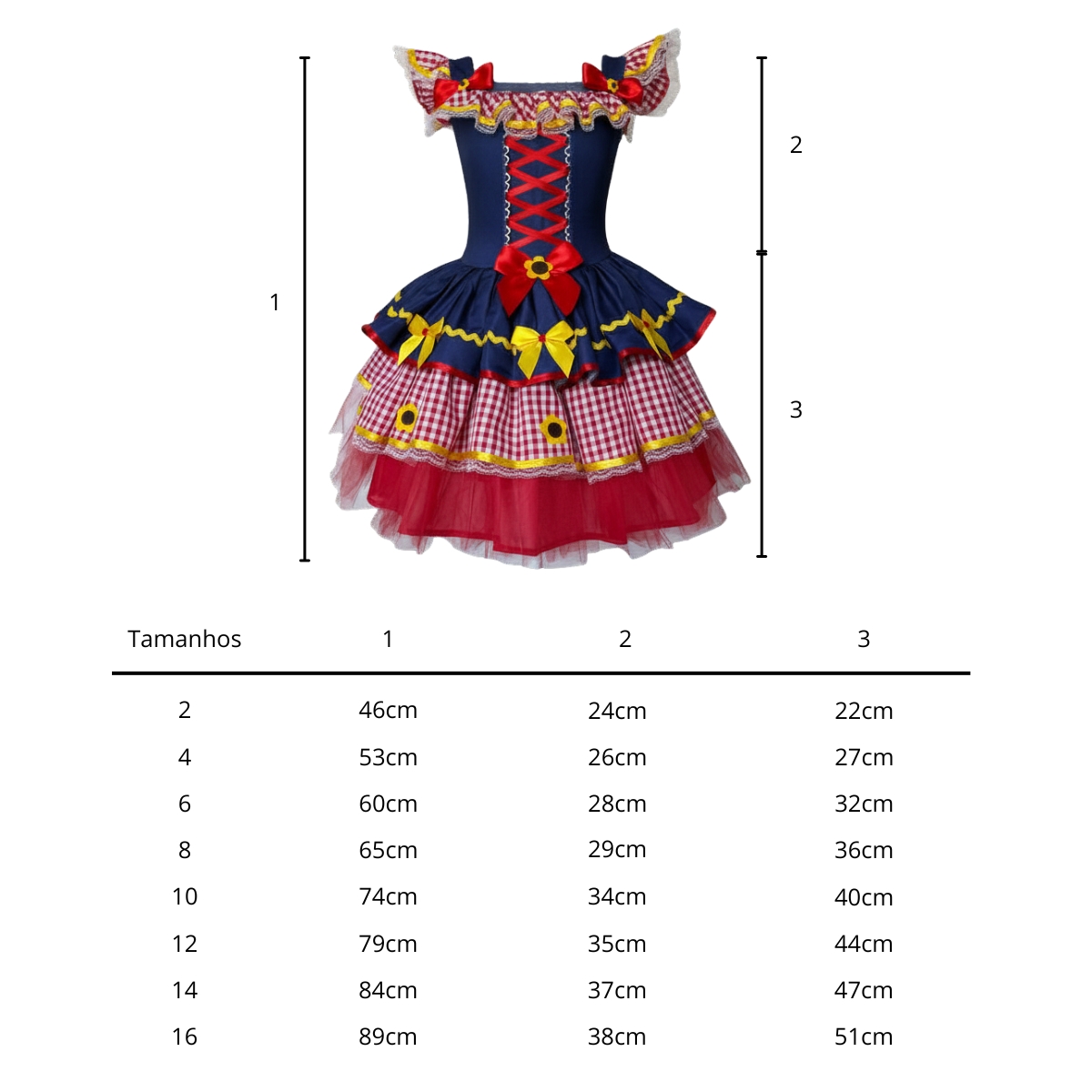 O vestido Jeans Caipira é uma releitura dos modelinhos mais clássicos desse estilo, com as alcinhas delicadas e modernas trazem conforto e visual para o look para as Festas de São João. Com elementos que remetem a girassóis, deixando o vestido ainda mais charmoso e temático das comemorações de Festa junina. O tecido do corpo estica se ajustando confortavelmente, a saia possui forro e tem mesclas de tecidos e estampas deixando o visual ainda mais na temática caipira, unindo o xadrez ao jeans.
